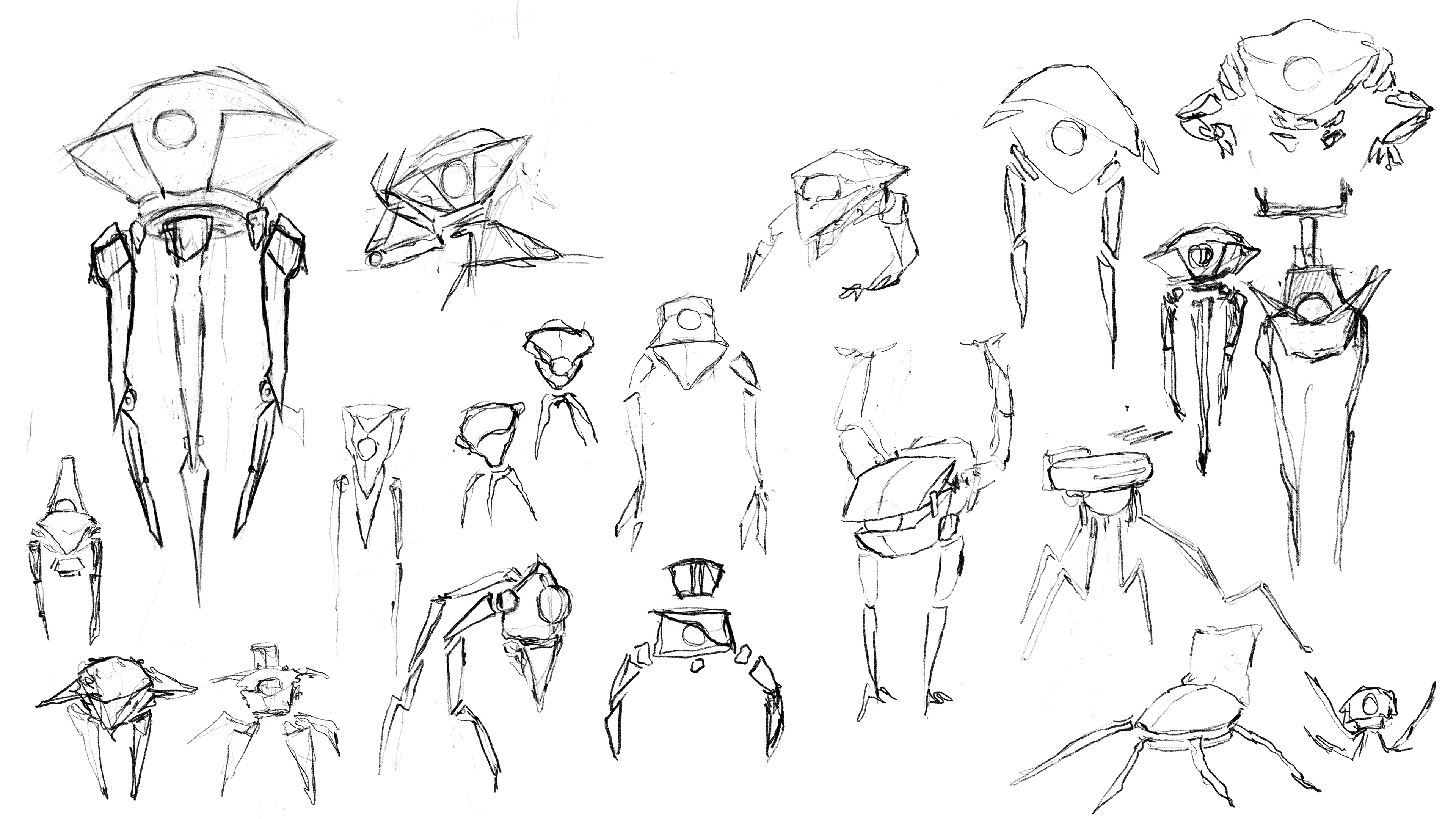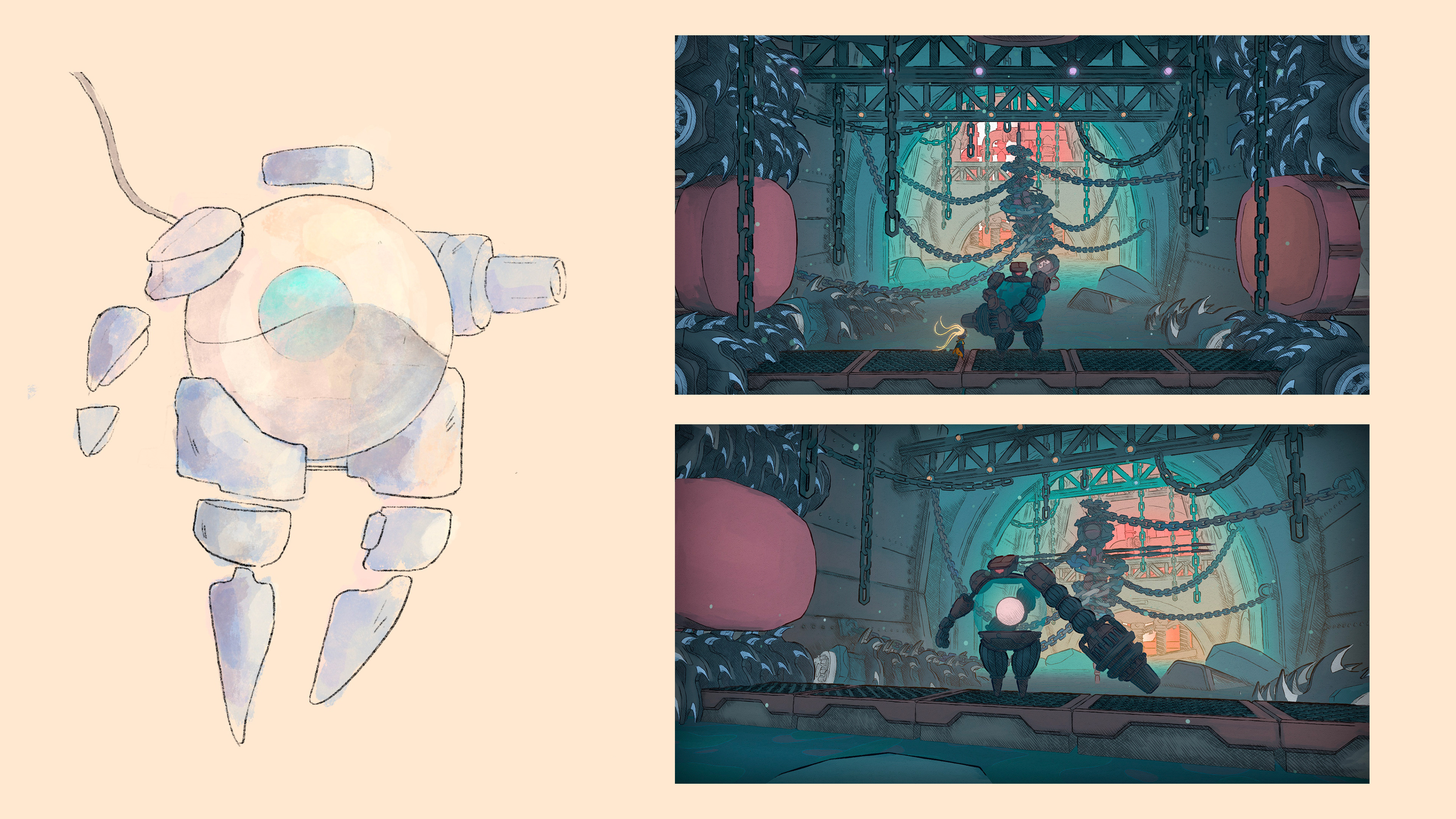 ↓ Recherches, croquis et concept art réalisés par mes soins pour le boss CROW, ainsi qu'un screen ingame du design final du boss réalisé par Étienne TBS, directeur artistique à Douze Dixièmes.