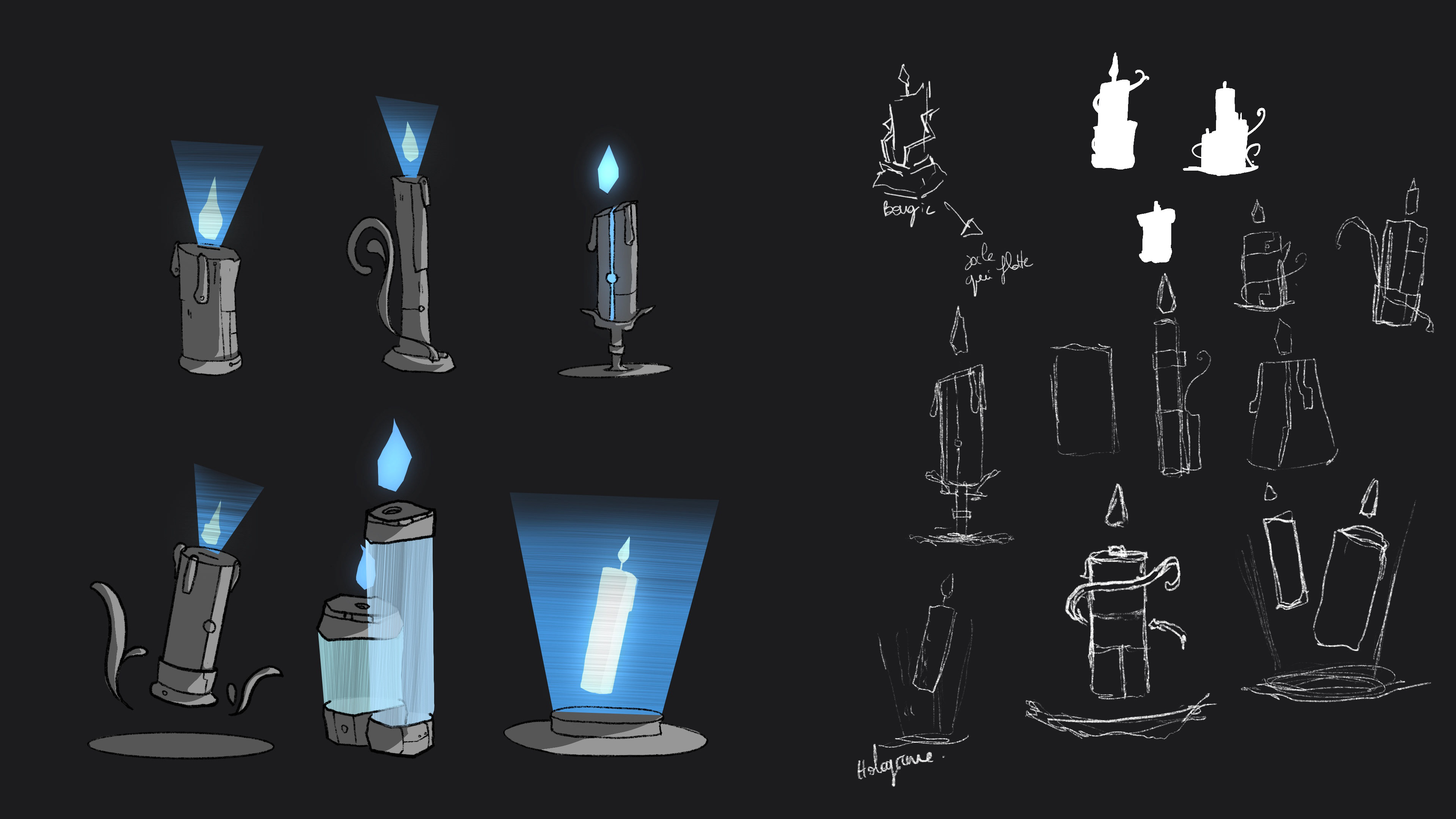 ↓ Recherches, croquis et concept art d'un props de bougie réalisés par mes soins, ainsi qu'un screen ingame du design final du props.